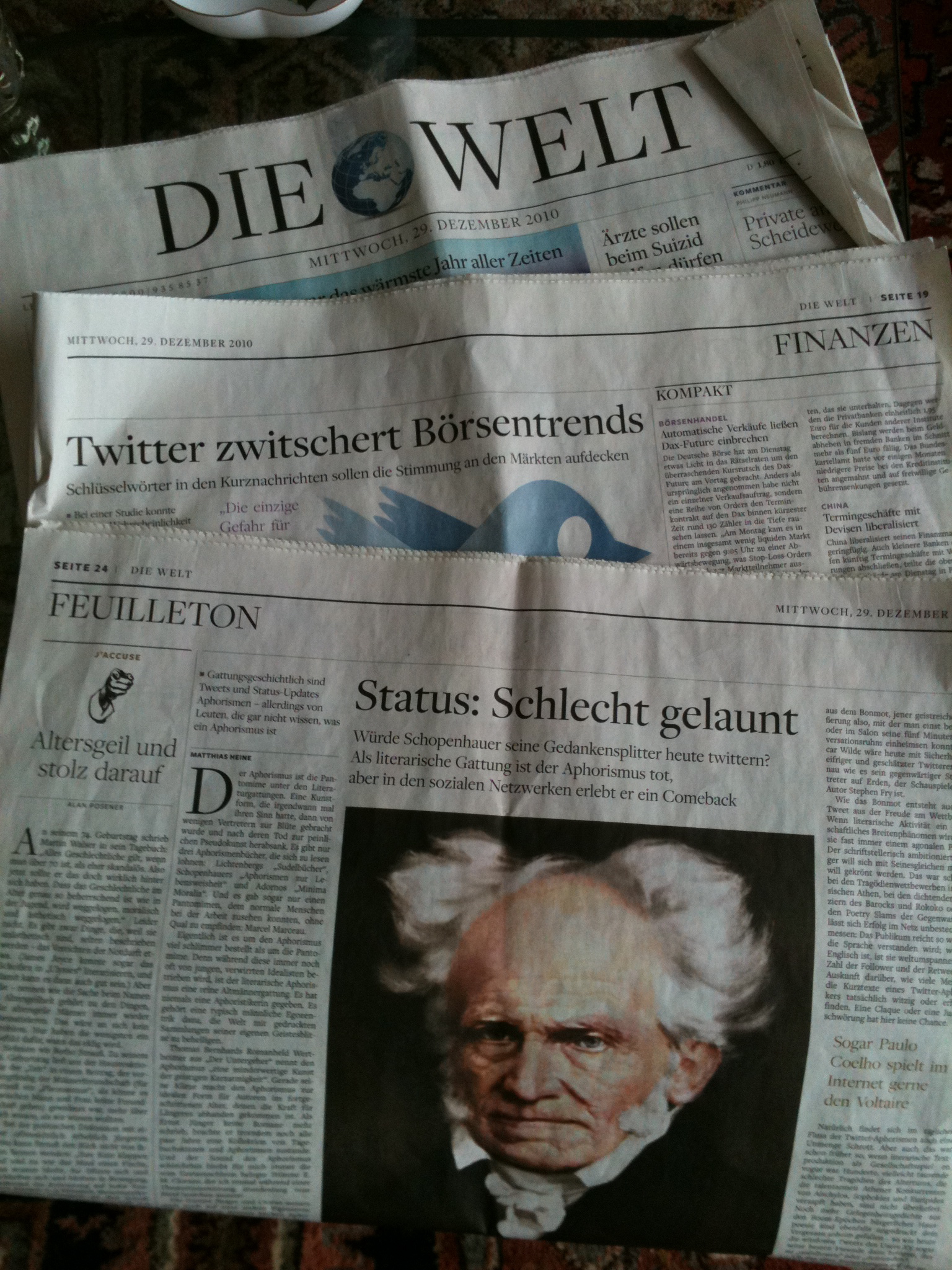 Ich hatte gerade die heutige Ausgabe der Welt in der Hand; und neben einem sehr kritischen Artikel über Google und Facebook habe ich vorallem zwei Artikel über Twitter bei Seite gelegt. Bei beiden handelt es sich um die bekannte Microbloggingseite – aber es geht um sehr verschiedene Umfelder: die Litteratur der vergangenen Jahrhunderte, und Finanzen der Gegenwart (und der Zukunft!)