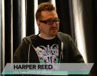 Here’s a very interesting and inspiring talk by Harper Reed (“Probably one of the coolest guys ever“), former CTO of the pioneering t-shirt company Threadless. Threadless is a community-based company that crowdsources t-shirt design and selection, which means that people can (1) submit designs, (2) vote designs up/down… and (3) buy t-shirts! As more and more companies try to leverage communities, let’s listen at someone who succesfully did it. See the (funny) video after the break.