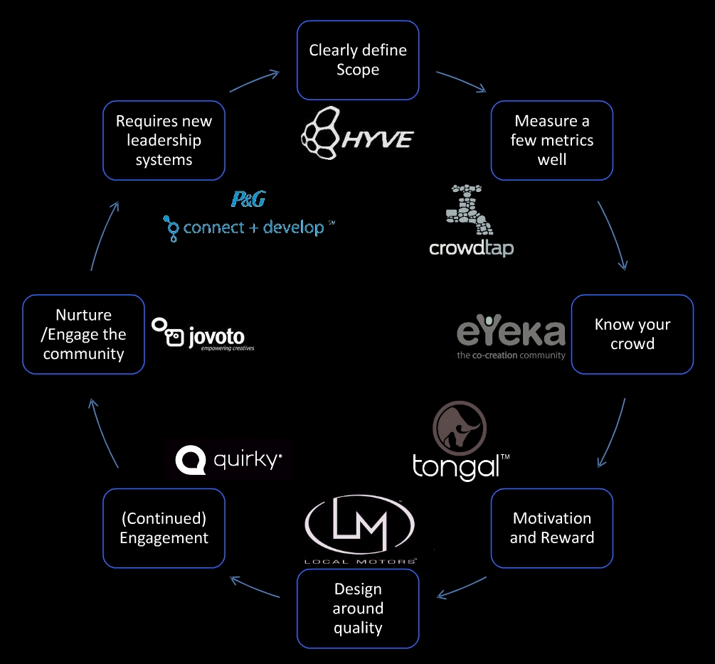 In Esposti’s Open Innovation category, we still find lots of different actors: specialized contest platforms (Idea Bounty, eYeka, InnoCentive, Atizo), innovation platform providers (Chaordix, Ideaken, NapkinLabs) and even private corporate initiatives (Netflix, Nokia Bata Labs) or a mix thereof (Local Motors). Now what does it take to rend crowdsourcing initiatives successful? Check out the following image retrieved from Carl’s presentation, where he stated seven habits that should at least facilitate crowdsourcing initiatives.  I added some examples of companies who do these particularly well (to my opinion):