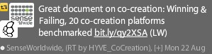 When Hyve retweeted Sense (two renown co-creation consultancies), I thought the information must really be interesting. And it was. A report about Winning and Failing Co-Creation Platforms which compares 20 different platforms by interest, community scope or interaction tools.