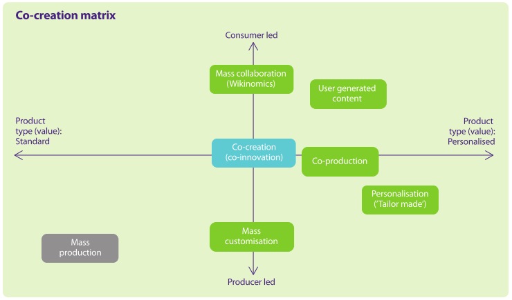 This representation stems from an academic paper from the people from Promise Corp, a British co-creation consultancy. Called Co-creation: New Pathways for Value, the document is actually a visually pleasant version of an academic paper 😉 and features visualisations such as the above “co-creation matrix” that compares different consumer-engagement techniques according to the role of the firm (y-axis) and the type of value created (x-axis). It looks cool… but doesn’t really differentiate co-creation from other techniques (rather does it show how the different techniques (in green) are versions of co-creation).