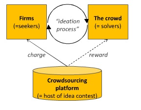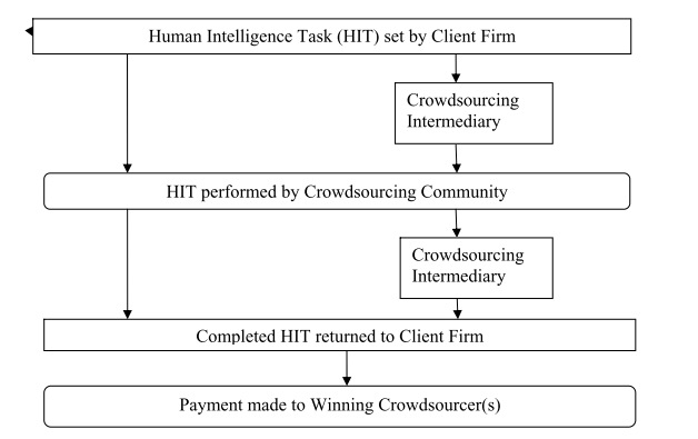 An interesting visualization is this one because it’s the only one to actually show the “active” role that should be played by the crowdsourcing intermediary. This one is not only responsible for having a crowd of potential contributors, but also to issue the call (“source contributions“) and to aggregate the content (“aggregate contributions“). Being actively involved in crowdsourcing in my day job, I can say that this latter stage is very important for the organizations who sponsor crowdsourcing initiatives, because it’s easy to get lost, it’s time-consuming if contributions are incomplete etc. You’ll find Geiger et al.’s paper, which is based on a review of 46 examples of crowdsourcing-based organizations, here.