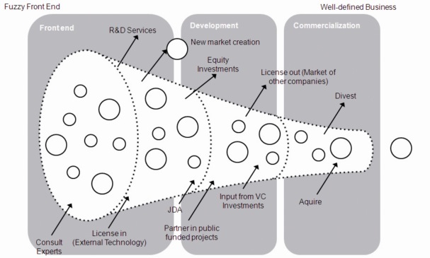 Another funnel-like representation, that still focuses a lot on technology/partners and not a lot on consumers. The article content is very much about consumer input, though: “the role of the customer changes increasingly from that of a passive consumer to an active co-innovator, co-producer and co-designer of the innovation process“, it says in the early part of the article (from which this figure is taken). But beside underlining the oppotunities of Open Innovation, it also highlights some risks like dependency towards external idea providers or misuse of resources by users. Talking about this, I highly recommend this paper about negative side effects of customer integration.