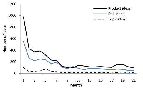 Right after writing that blog post about crowdsourcing at Dell, I read an interesting piece of research about participation in the Dell Ideastorm crowdsourcing-platform. The paper is authored by Barry L. Bayus an d will be published in Management Science in the next months (see the first version, and the second version – by the way, it’s a great way to see how mauch a paper evolves durring the reviewing process). While it has not been published yet, the findings are interesting to look at, because they’re among the first ones to analyze participation in crowdsourcing over time. And it seems that there are challenges ahead for Dell…