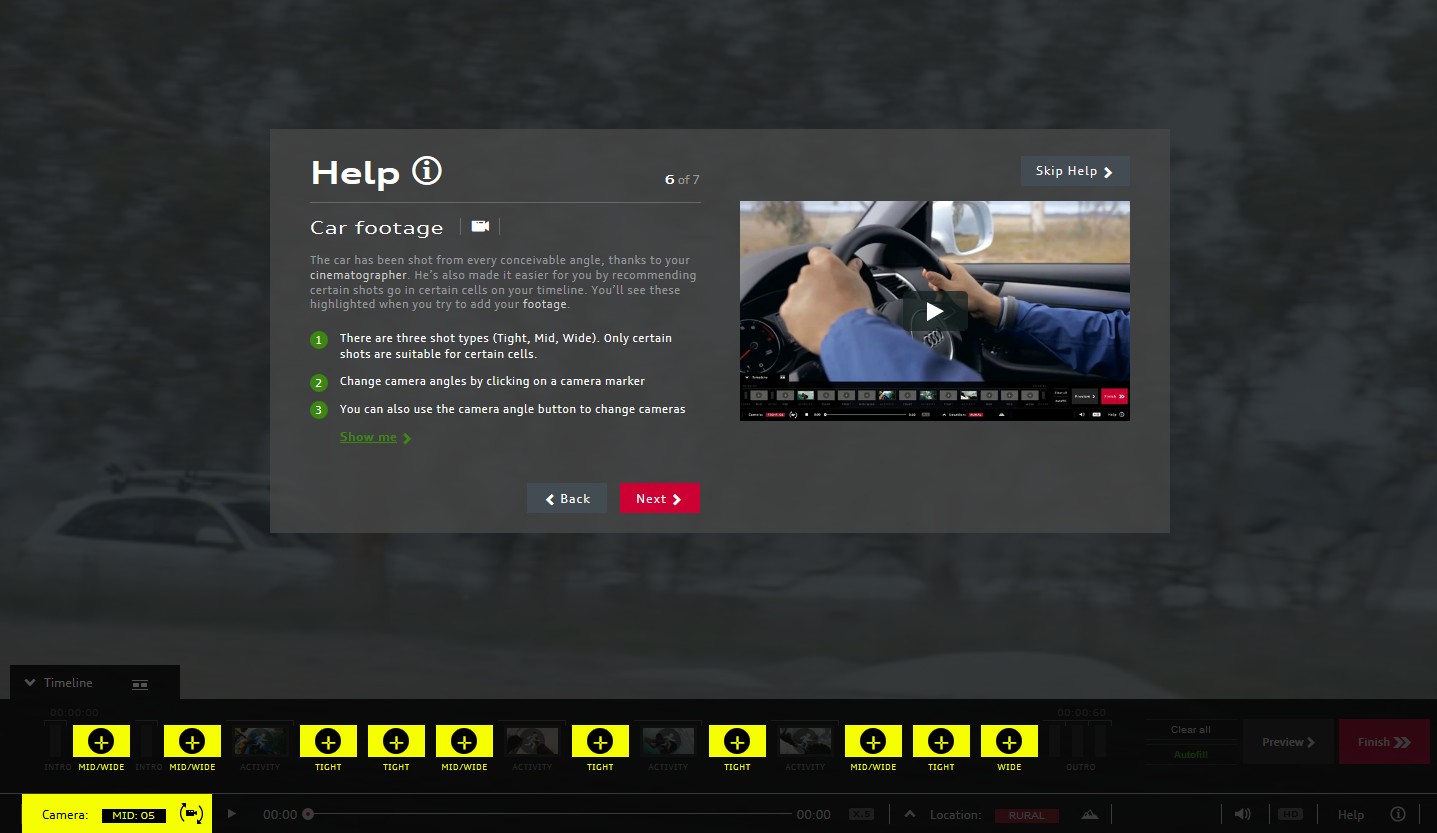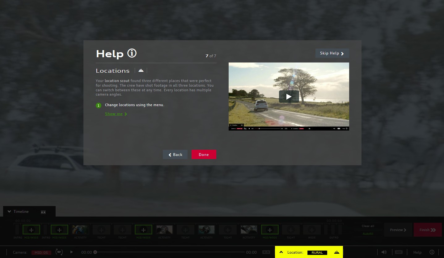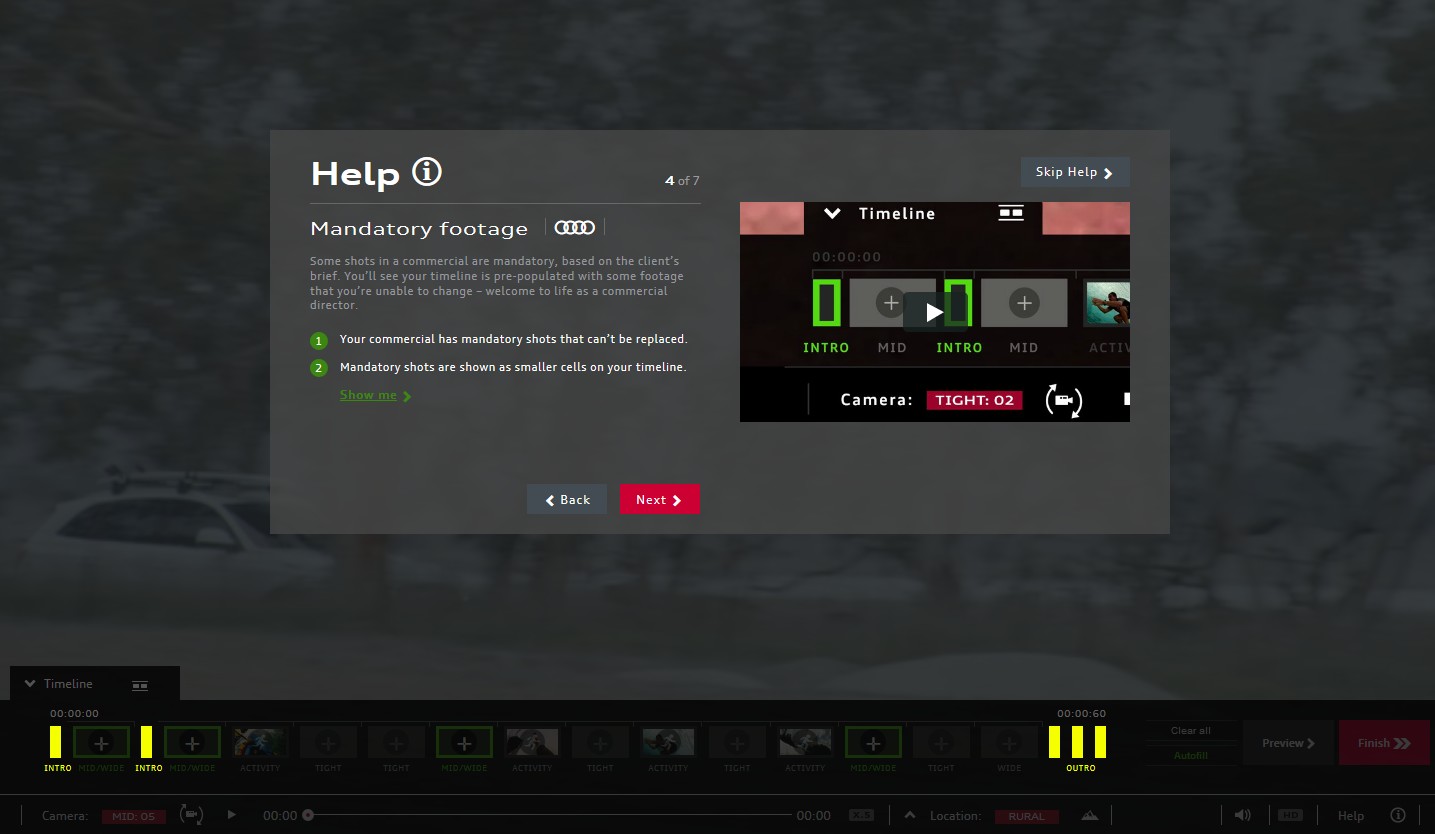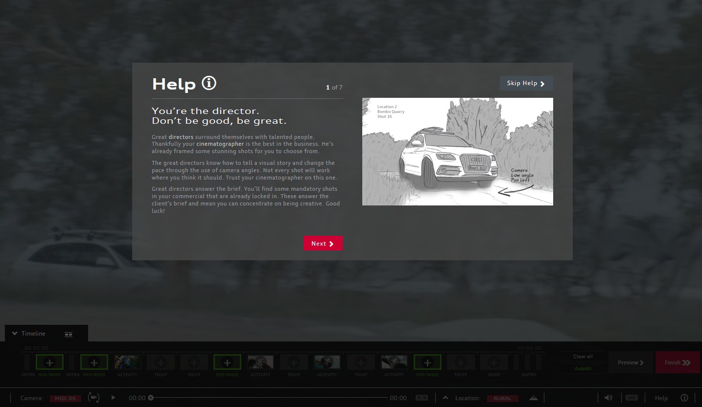 The introduction screen: “Great directors answer the brief. You’ll find some mandatory shots in commercial that are already locked in. These answer the client’s brief and mean you can concentrate on being creative”