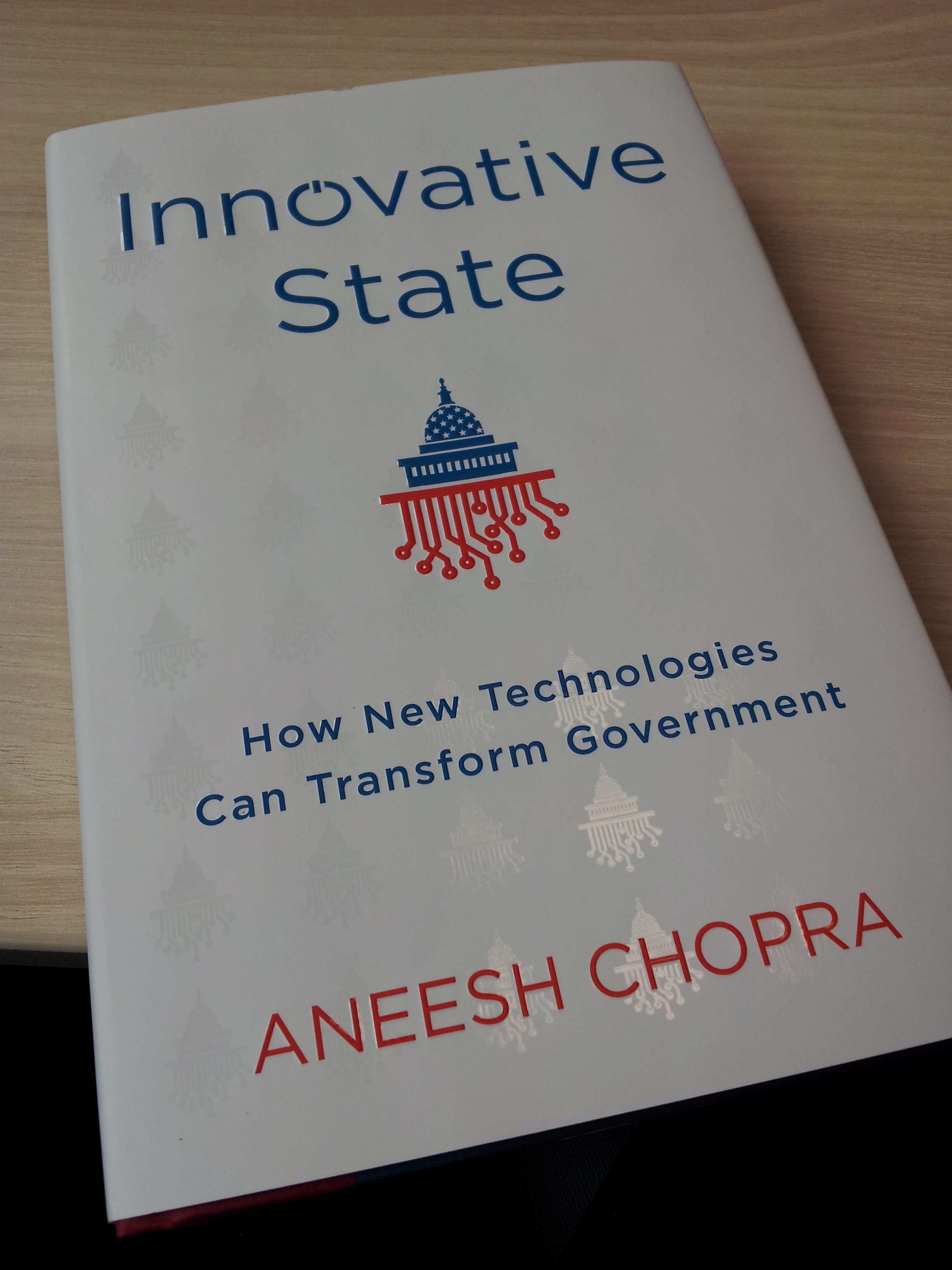 I got myself a copy. The cover looks great, the branding is sharp, and the opening words are “Government doesn’t work.” Chopra explains that public service has not always not worked in the United Stated (in fact he gives many examples of innovations that came from the public sector) but that the massive, hierarchical bureaucracy has emerged in the 20th century as a reaction to the massive, powerful corporations that made up the power of the United States.
