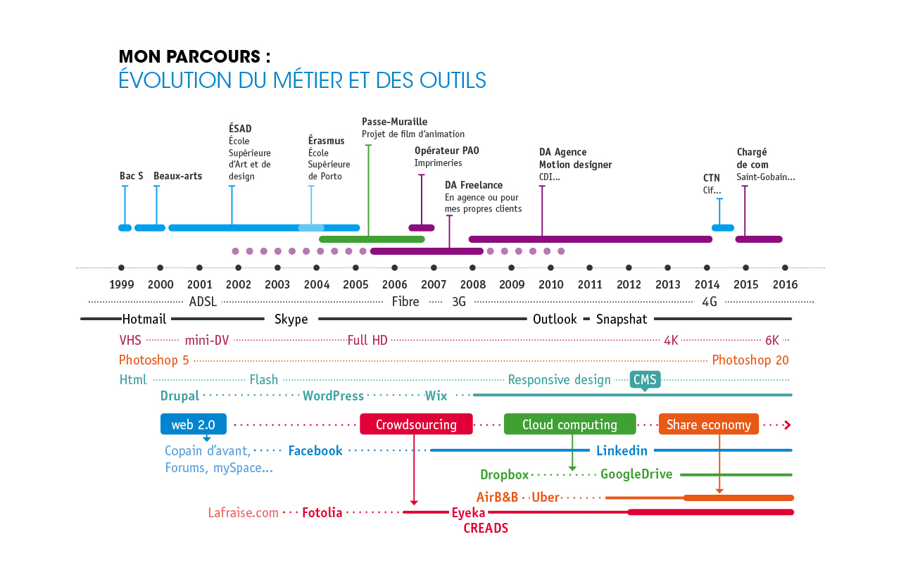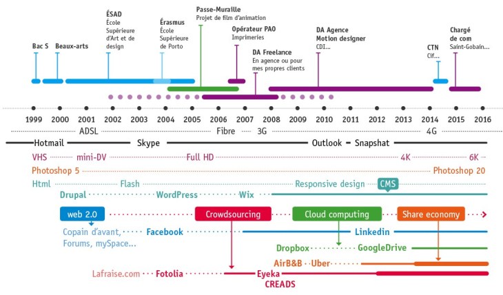 An interesting visualization of Damien’s curriculum: his projects and roles above the dates, the evolving communication tools below (source: Damien Henry)