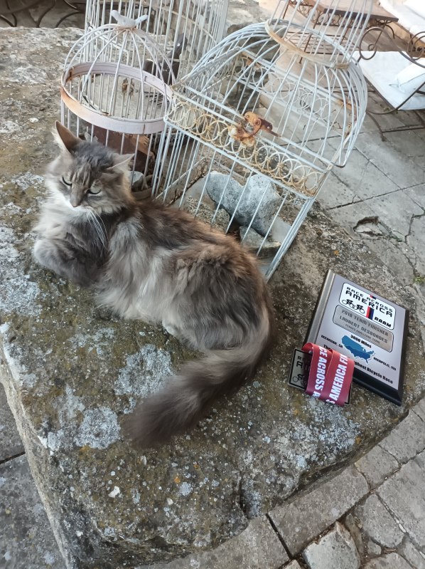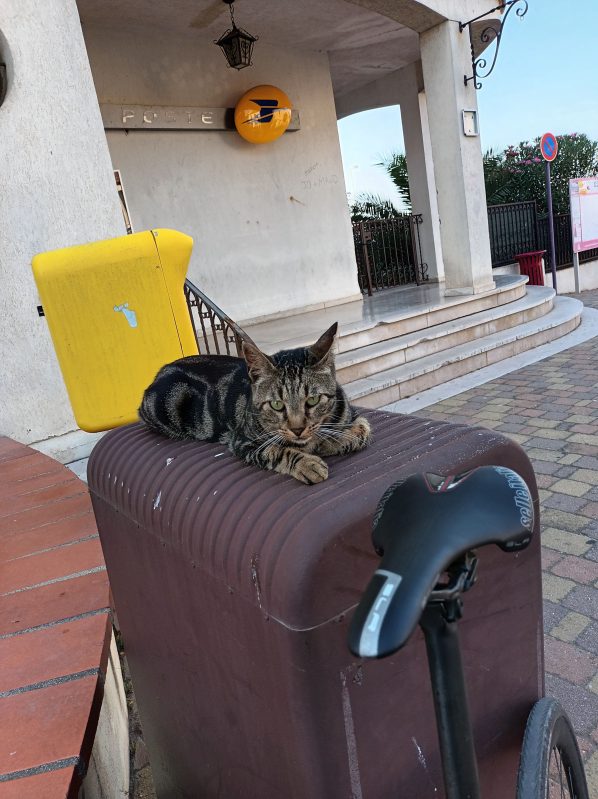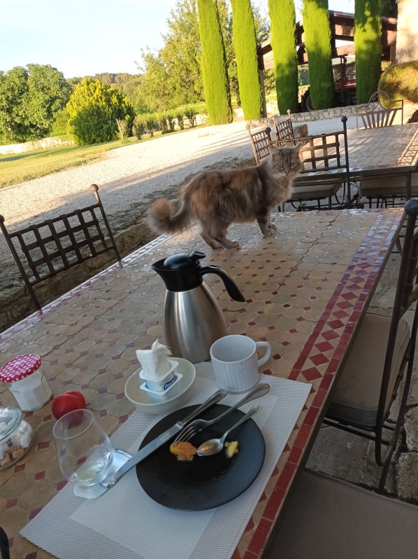 My bike stayed in one of the tool sheds of the cottage, locked, and I was handed the key by the owner so that I could leave early in the morning. Above you’ll only get a glimpse of the breakfast, the cat being a quirky encounter in the village of Saint-Génis-des-Fontaines, where I went to buy newspapers and get dinner.
