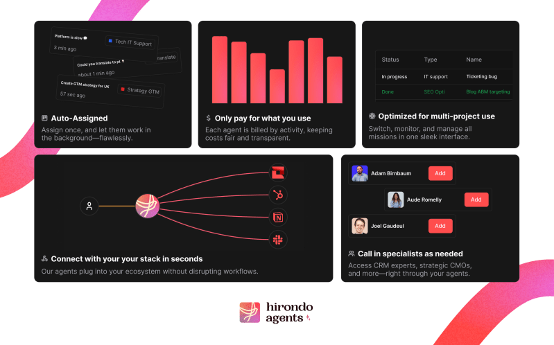 Marketed as the first truly autonomous freelance marketer, Hirondo Agents operate without human supervision, integrating instantly into existing workspaces (Slack, Notion, ClickUp, Google Workspace, etc.), and delivering across the full marketing stack: strategy, branding, content, growth, and CRM.